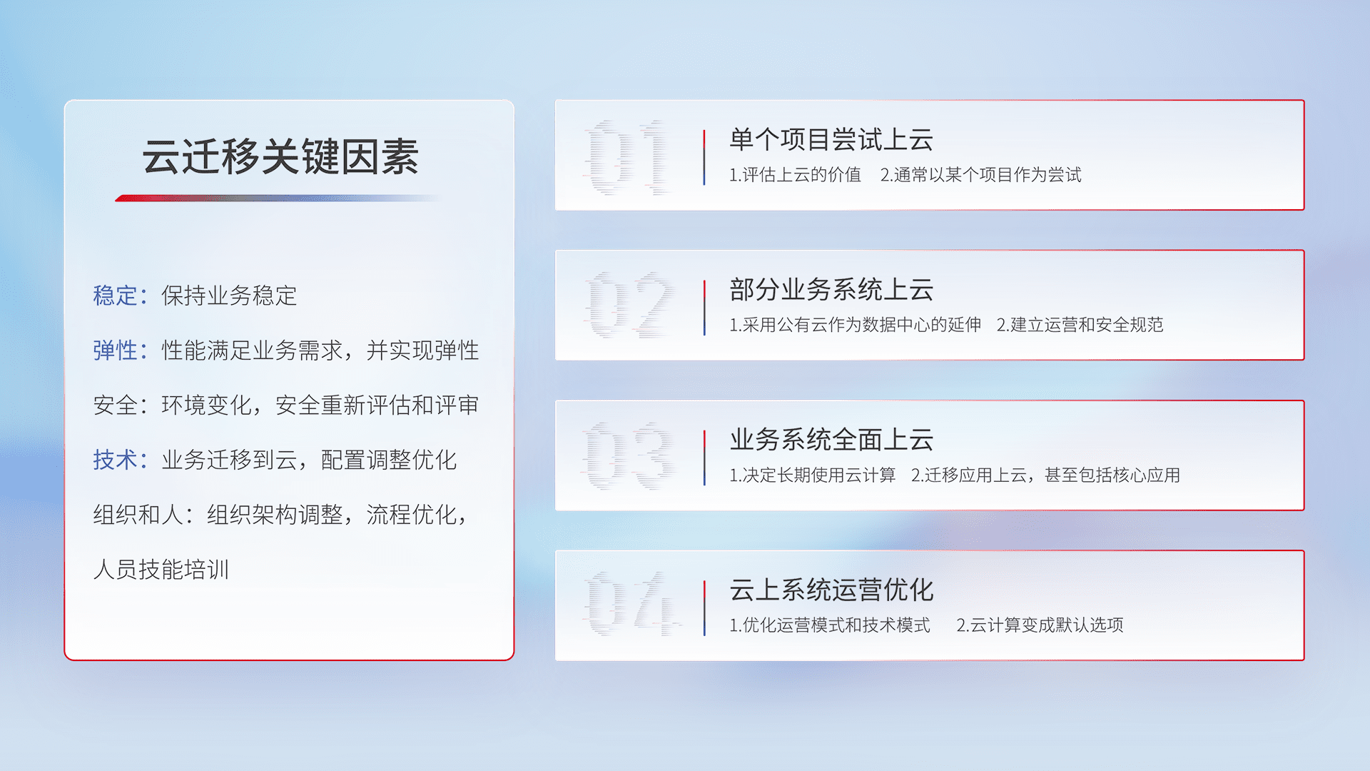 结合实际业务,,从规划设计、、、云平台选型、、、云原生改造、、、、数据迁移、、、、集成交付,,,,迁移全过程为客户识别最佳上云路径,,做好风险识别管理,,设计网络架构、、、、身份权限、、、安全审计合规、、、操作审计、、日志审计、、监控告警策略、、、、多站点容灾设计等,,,,对云上基础设施进行整体规划,,,,提升IT治理水平,,以满足弹性、、高可用、、、高性能的需求。。。